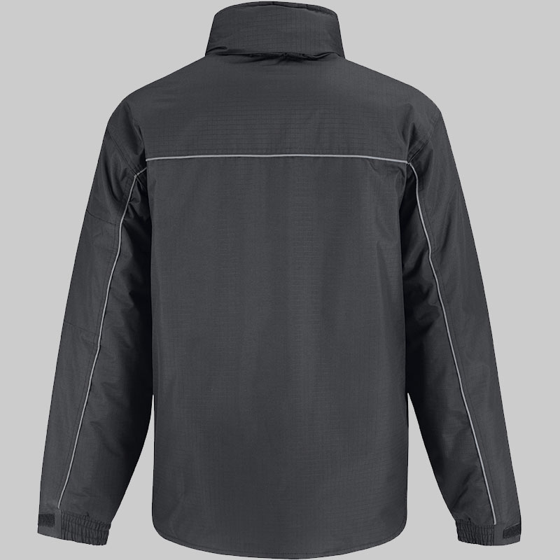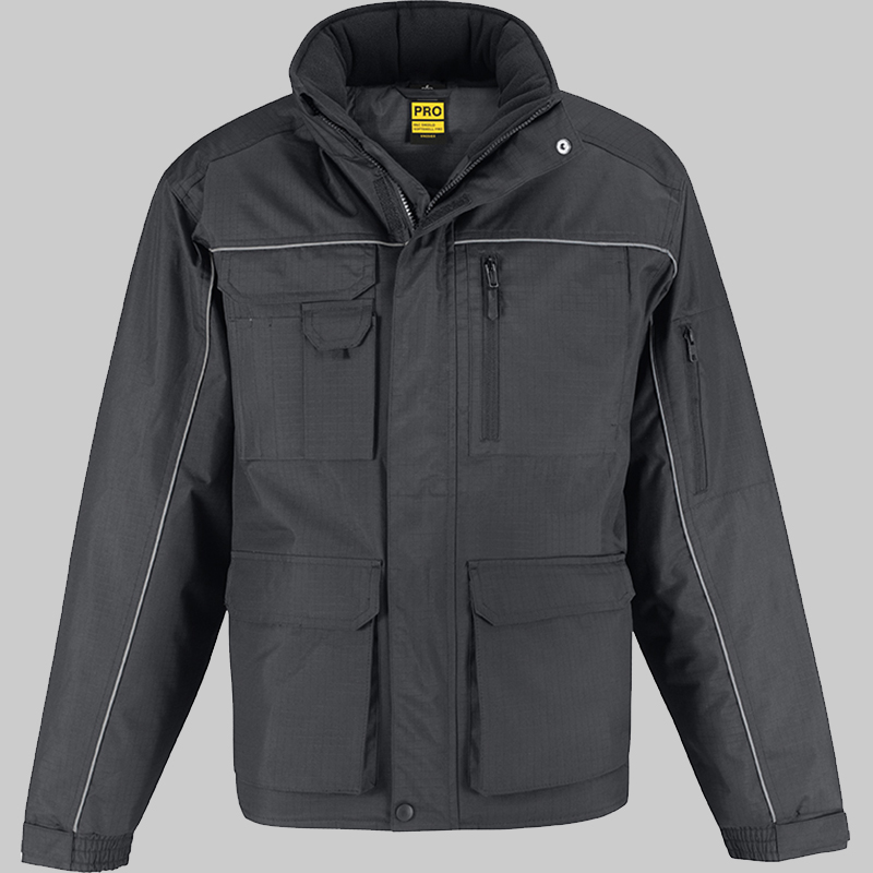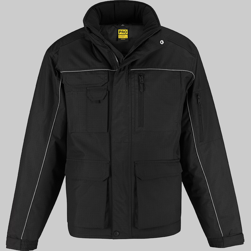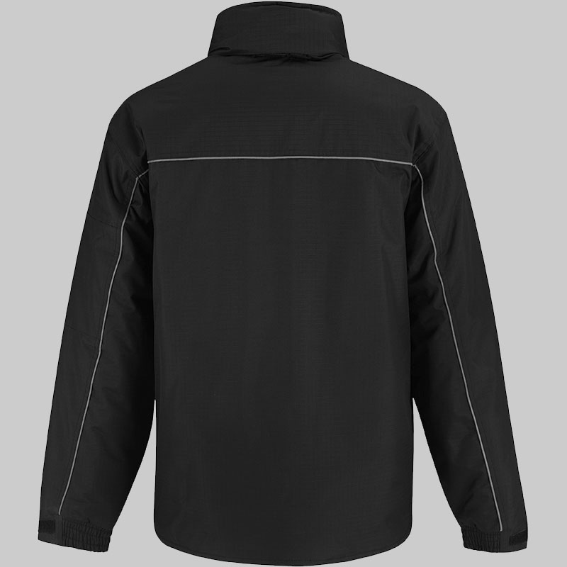 Camada exterior: 100% poliéster pongée rip-stop impermeável (5000 mm) e corta-vento. Camada interior: forro 100% poliéster acolchoado 200 g/m². Costas mais compridas, gola subida forrada a micropolar com protecção para o queixo e pala exterior anti-intempéries. Detalhe reflector na parte frontal e traseira. Capuz ergonómico forrado integrado na gola com cordão elástico e 2 stoppers. Punhos ajustáveis. Costuras com pesponto duplo nos ombros, nas cavas e nos bolsos ao nível do cós, com presilhas. 12 bolsos multifunções (vários bolsos largos com pala de protecção, bolso no peito exterior com fecho, bolso exterior para smartphone, 3 bolsos para canetas e 2 bolsos frontais forrados a polar com pala mas com acesso lateral para encaixar as mãos, 1 bolso para a carteira cosido no interior com pala e 1 bolso com fecho na manga). De fácil acesso para personalização. Gramagem: 230 g/m².
