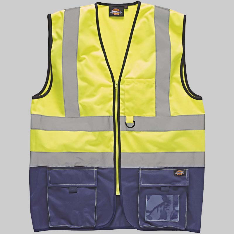 100% poliéster. Duas faixas de alta visibilidade com 5 cm no corpo e uma faixa em cada ombro. Com fecho. Bolso no peito esquerdo para lápis, chaves e telemóvel. Dois bolsos frontais em baixo com palas com velcro. Bolso do lado esquerdo “escondido”. Presilha na zona frontal. Bolso com porta identificação em material transparente. EN ISO 20471:2013 tipo 1.