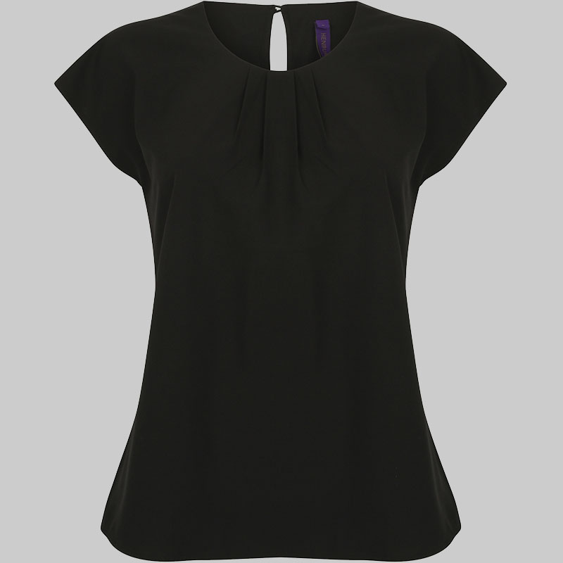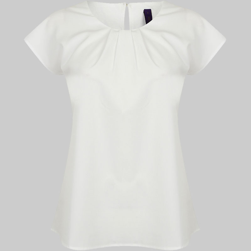 100% Cofrex poliéster Pufy®: tecido inovador com toque de algodão, anti-UV, respirável e de secagem rápida, que não cria vincos. Decote com dobras decorativas e com botão na parte traseira. Manga curta. Bainha direita. Tratamento fácil. Gramagem 115 g/m².