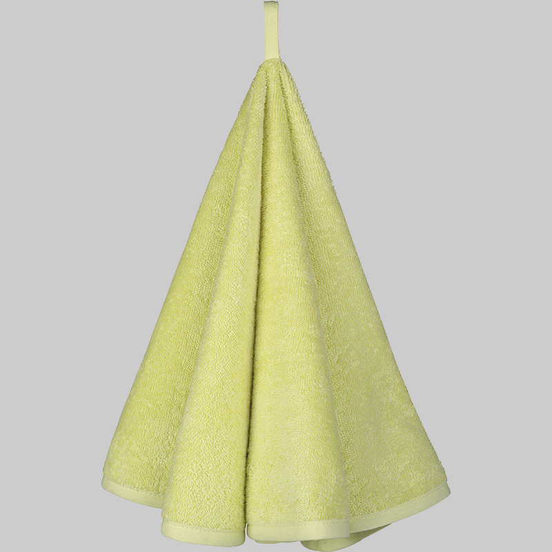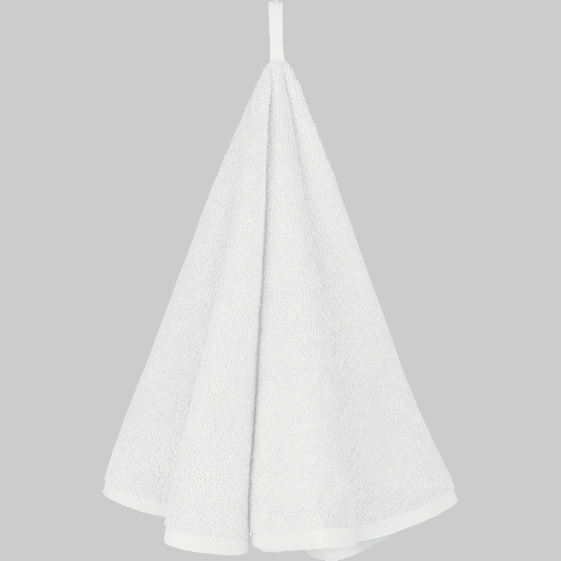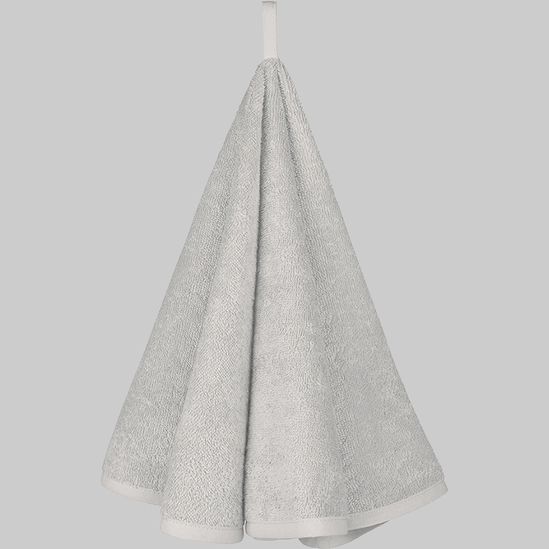 100% algodão. Presilha na zona central, recobrimento na bainha. Diâmetro: 70cm. Gramagem: 400 g/m².