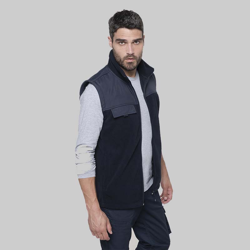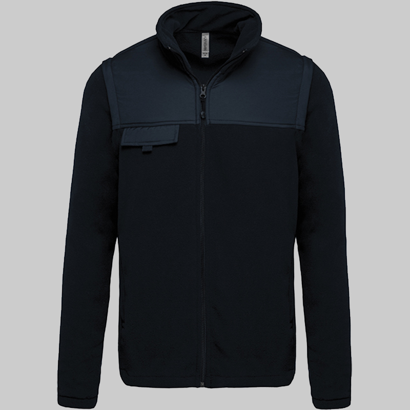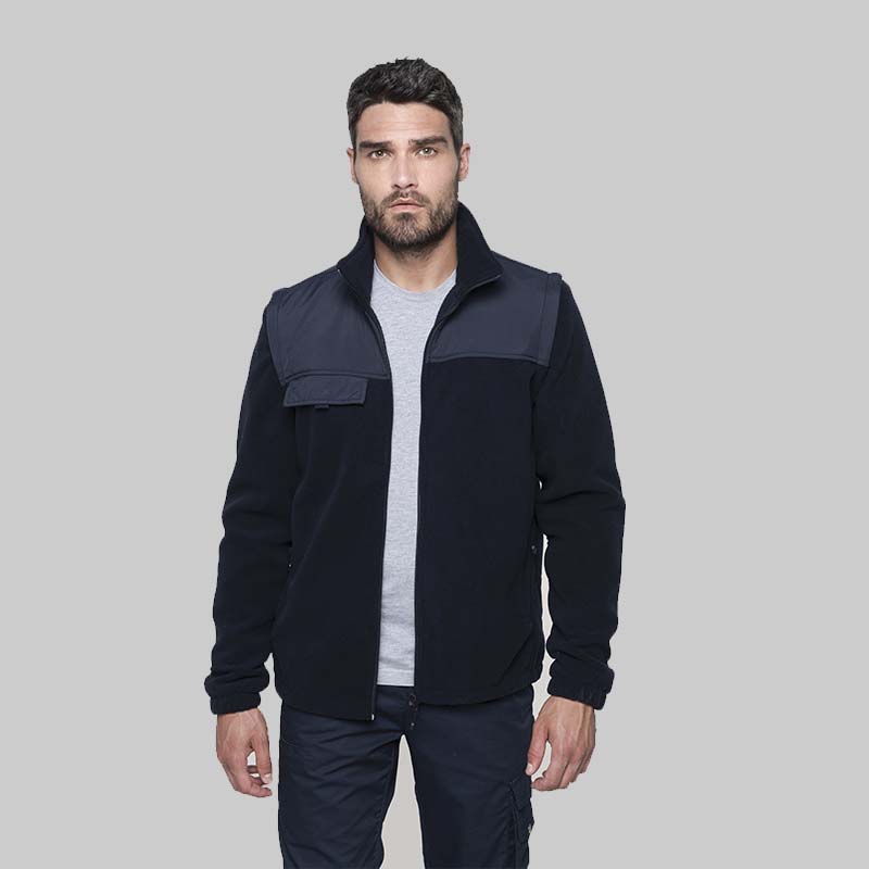 Exterior: polar 100% poliéster 400 g/m². Reforço em 100% poliéster Taslon com revestimento acrílico. Forro interior das mangas em poliéster 210T. Casaco polar 2 em 1. 2 bolsos frontais com fecho e 1 bolso no peito com pala e ajuste em velcro. Encaixes em tecido tom sobre tom na frente, costas e nos braços. Personalização fácil na frente e costas. Mangas amovíveis com forro em poliéster para maior conforto. Punhos e cós elásticos. Gramagem: 400 g/m².