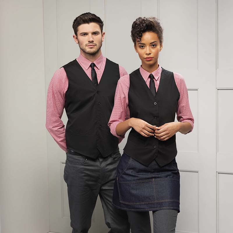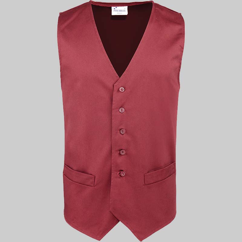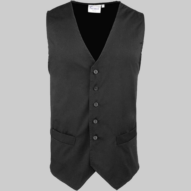 65% poliéster / 35% sarja de algodão. Colete com 5 botões. 2 bolsos frontais. Lavagem industrial a 85 °C. Lavagem doméstica a 60 °C. Gramagem: 195 g/m².