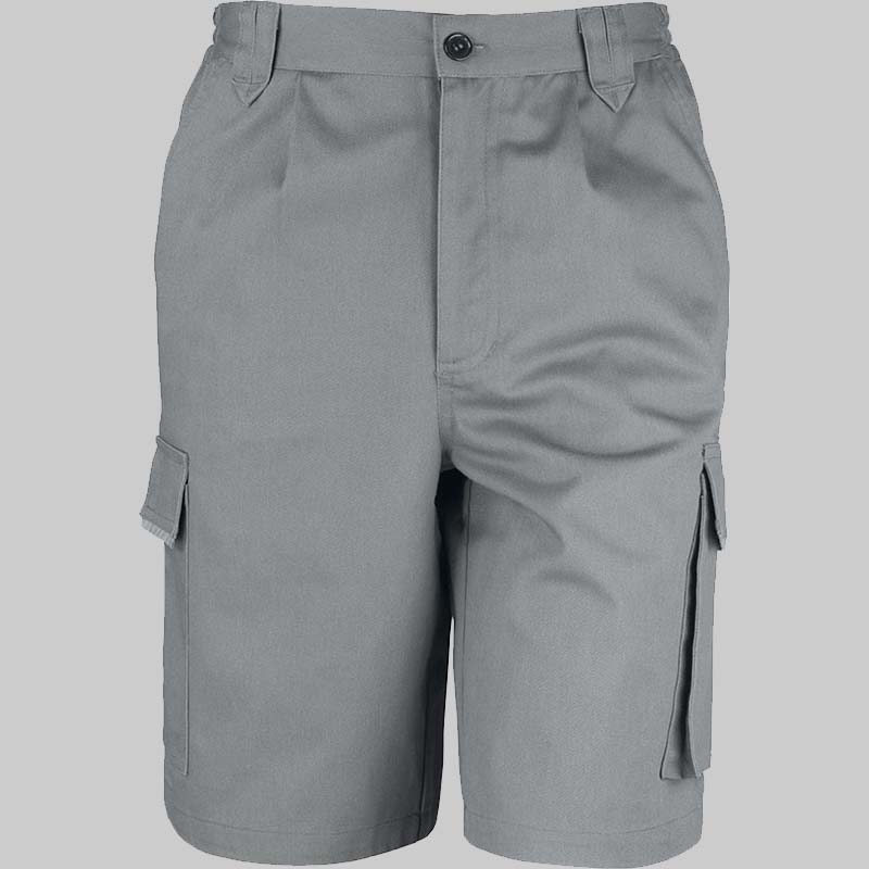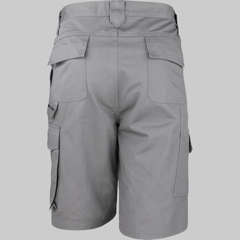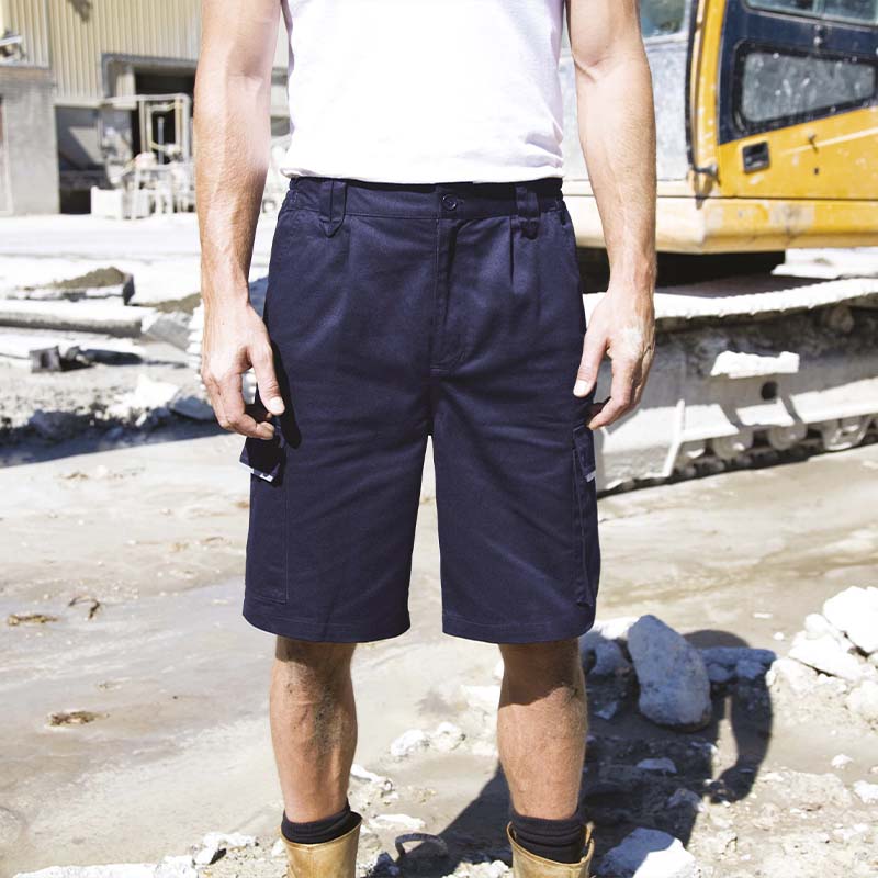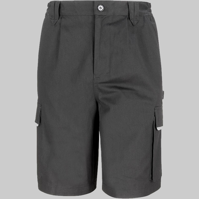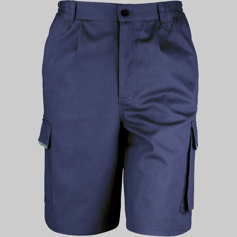 65% poliéster / 35% algodão. Calções corta-vento. Cós ajustável. Breguilha com fecho e mola de pressão. Presilhas na cintura. Costuras reforçadas com pesponto duplo. Multibolsos: bolsos laterais largos com acabamentos reflectores, bolso de carga frontais com fecho em Velcro®, bolsos traseiros, bolso para telemóvel, bolso para fita métrica, 2 bolsos laterais fundos e presilha para martelo. Gramagem: 270 g/m².