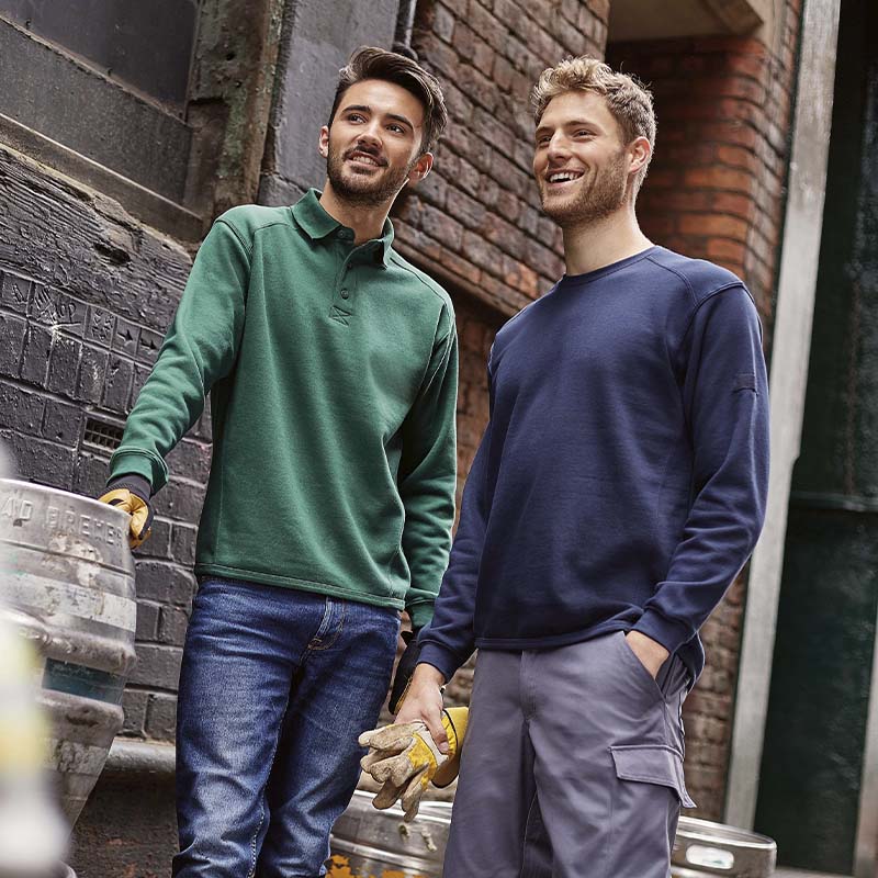 80% algodão penteado ring spun / 20% poliéster. Tratamento de protecção anti manchas SpotShield™. Reforço nos ombros para maior resistência. Encaixes laterais para uma liberdade total de movimentos. Decote e punhos em malha 1×1. Porta canetas elástico na manga. Lavável à máquina a 60 °C e secagem na máquina de secar roupa. Gramagem: 300 g/m².