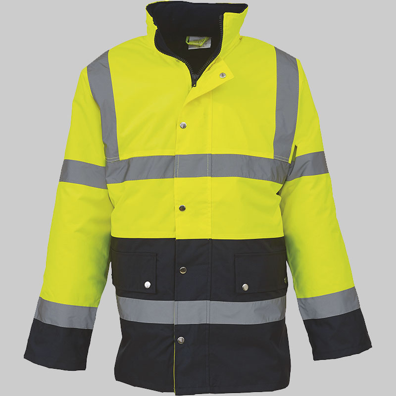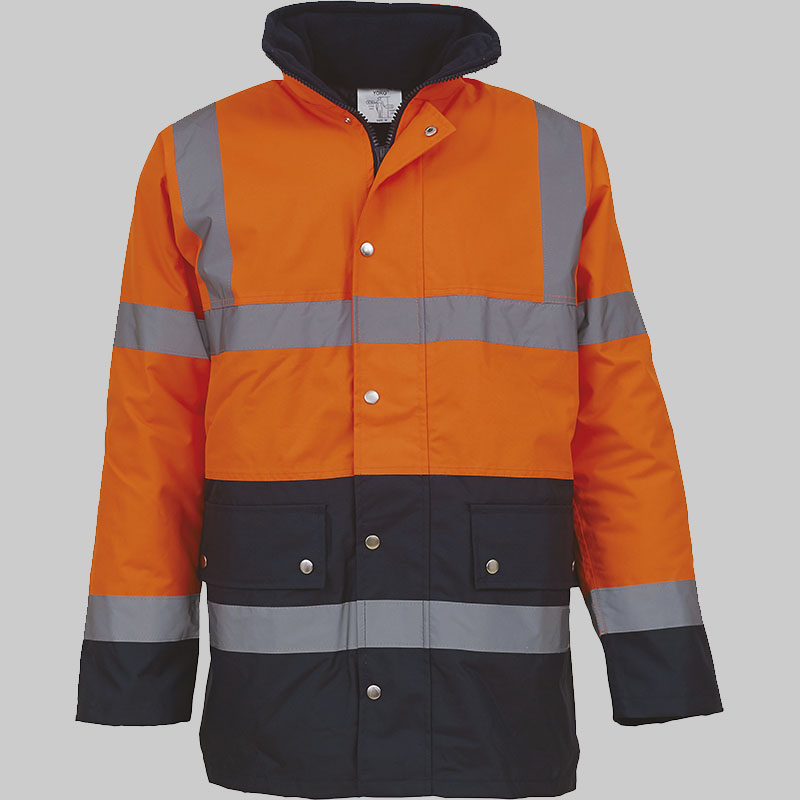 100% poliéster 300D com revestimento PU impermeável. Interior acolchoado com 190 g/m². Forro em nylon. Duas bandas retrorreflectoras 3M com 5 cm no corpo e braços e uma banda em cada ombro. Fecho ultra resistente à frente com pala contra o vento e molas de pressão. Dois bolsos exteriores com pala contra o vento. Punhos em tricot contra o vento. Capuz integrado na gola com cordões. Bolso interior ao nível do peito. Costuras cosidas e seladas para uma resistência à água perfeita. Em conformidade com as normas EN ISO20471:2013 Classe 3 e EN343 Classe 3.1 relativas à protecção contra mau tempo. Hi-Vis Orange/Navy também em conformidade com a norma GO/RT 3279.