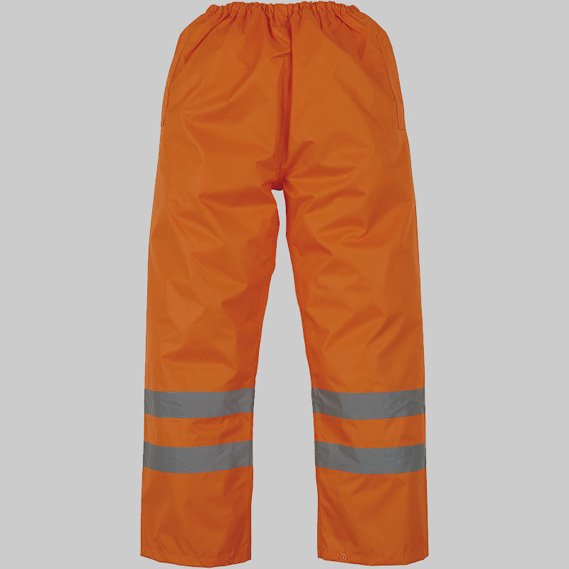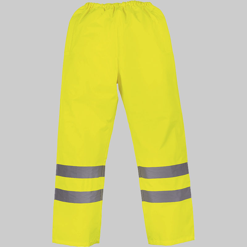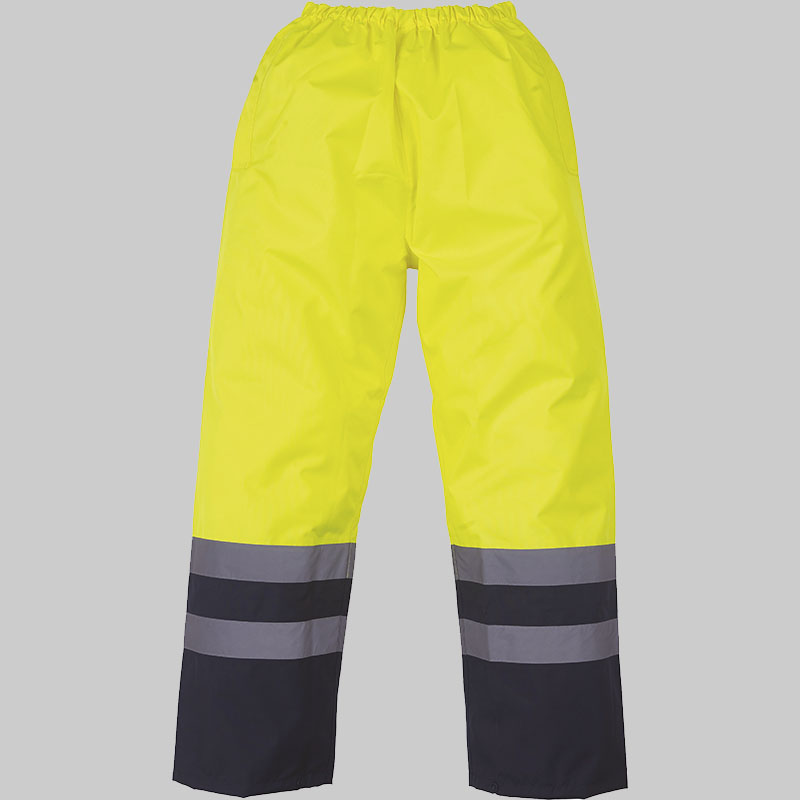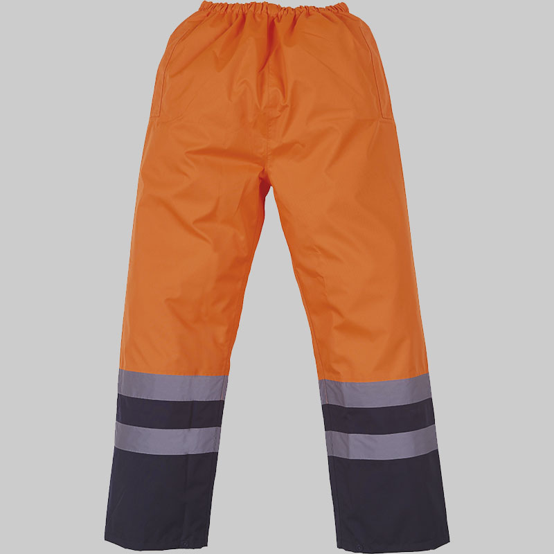 100% poliéster. Tecido Oxford com revestimento PU. Impermeável. Duas bandas retrorreflectoras com 5 cm de largura nos tornozelos. Cintura elástica. Molas de pressão nos tornozelos para ajuste. Costuras cosidas e seladas. Em conformidade com as normas EN ISO20471:2013 Classe 1 e EN343 relativas à protecção contra mau tempo: apenas Hi-Vis Yellow, Hi-Vis Yellow/Navy, Hi Vis Orange e Hi Vis Orange/Navy. Hi Vis Orange e Hi Vis Orange/Navy também em conformidade com a norma GO/RT 3279.